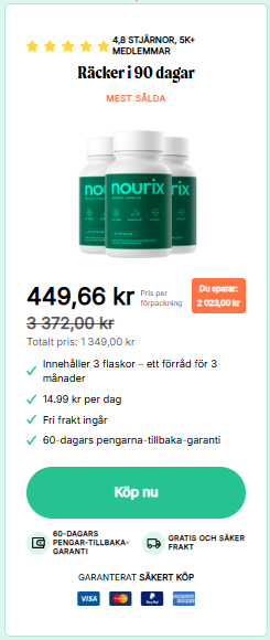 Varje köp av Nourix-tillskott backas upp med en 60-dagars 100 % pengarna-tillbaka-garanti, fri & säker frakt samt SSL-säker betalning. Så om du inte är nöjd med resultaten kan du helt enkelt utnyttja denna återbetalningspolicy för att få tillbaka hela beloppet. Även om Nourix-formulan är tillverkad med naturliga ingredienser kan effekten variera mellan individer. Om du har använt tillskottet under den rekommenderade perioden och inte fått de förväntade resultaten är återbetalningspolicyn din att utnyttja.