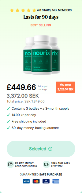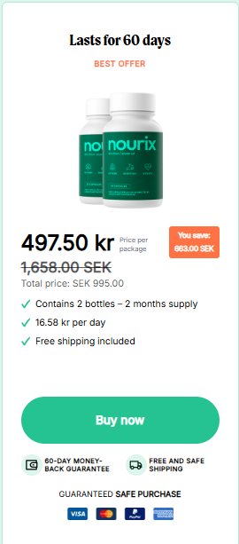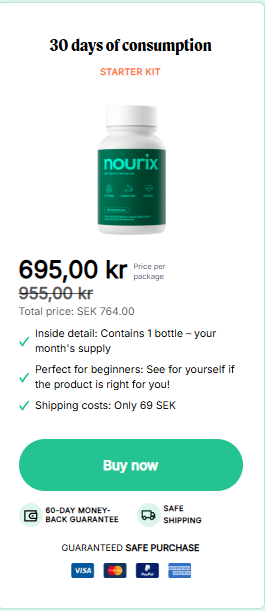 Varje köp av Nourix-tillskott backas upp med en 60-dagars 100 % pengarna-tillbaka-garanti, fri & säker frakt samt SSL-säker betalning. Så om du inte är nöjd med resultaten kan du helt enkelt utnyttja denna återbetalningspolicy för att få tillbaka hela beloppet. Även om Nourix-formulan är tillverkad med naturliga ingredienser kan effekten variera mellan individer. Om du har använt tillskottet under den rekommenderade perioden och inte fått de förväntade resultaten är återbetalningspolicyn din att utnyttja.